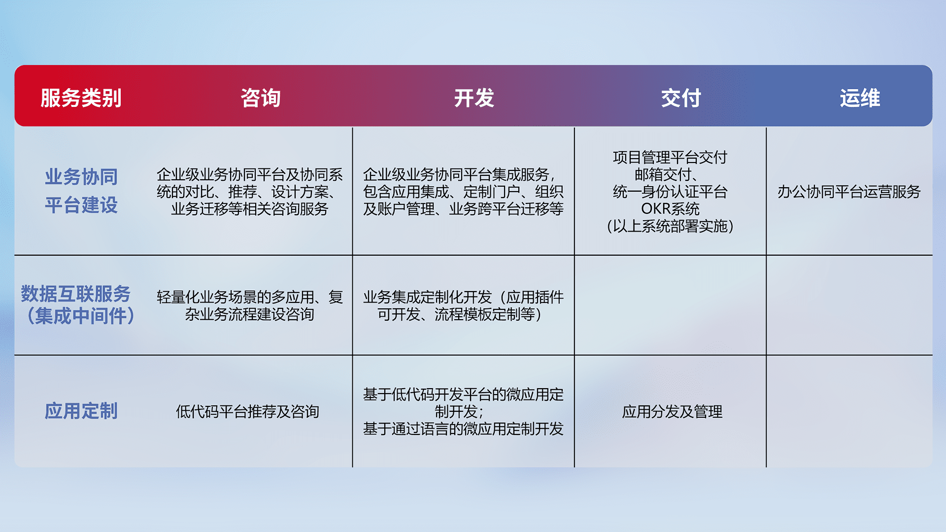 针对钉钉、、企微、、、、IDaas等平台级产品提供产品的规划、、、方案、、、交付、、定制化开发等服务,,,,实现如统一协同办公、、、智能客户服务、、、混合会议管理、、智能数据查询、、、等业务场景,,实现数字化转型。。。